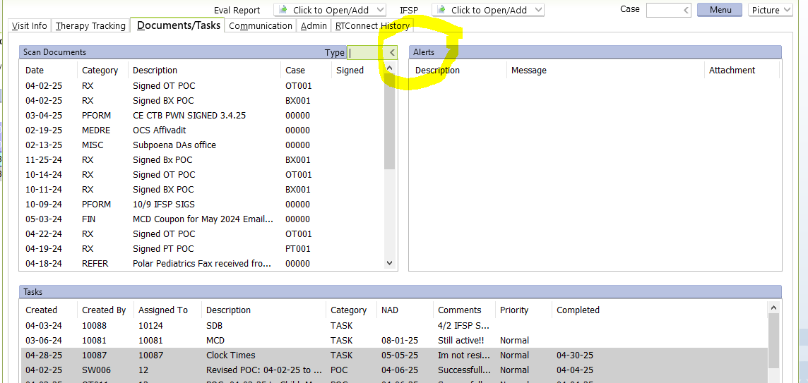 • Add alert in Documents/Tasks --> Alerts section. You can even include unsigned forms for provider ease of access/information if ROI is waiting to be signed.