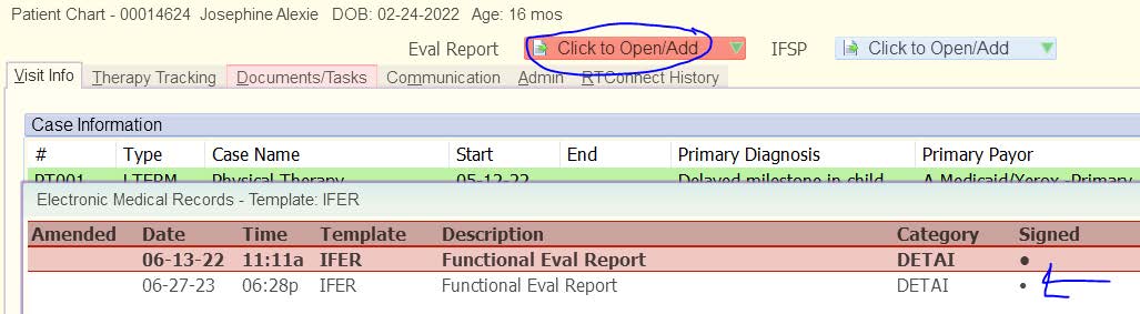 In Patient Chart, in the upper center/left corner is the ‘Eval Report’, click on the bar ‘Click to Open/Add’ , it will take you to the Functional Evaluation medical records, enter ‘A’ to Add.