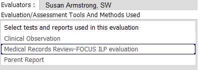 In the case of an evaluation from another ILP/non-provider specific report, go into medical records and get the evaluators from that report for the roles drop down in SDB.