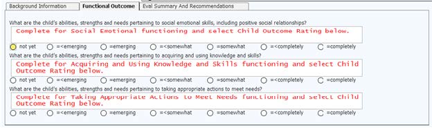 Note: For Functional Outcomes, after rolling be sure that each outcome (radio) button is checked appropriately for each area (1. social emotional, 2. acquiring and using knowledge and skills, and 3. taking actions to meet needs).