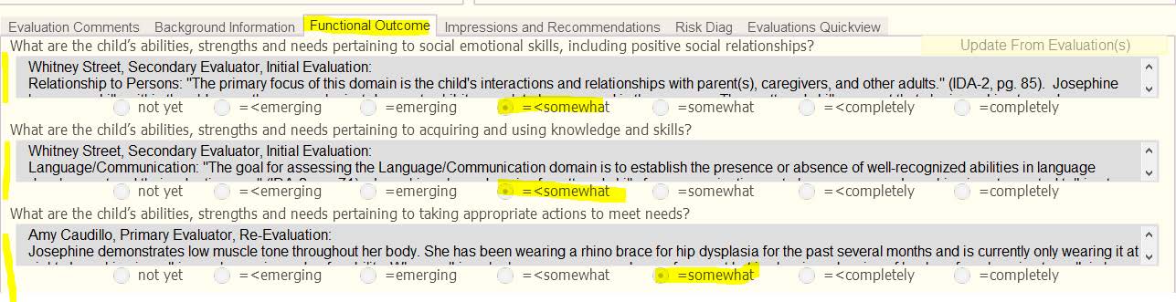Pro tip: The outcome ratings do not pull from the primary evaluation and need to be entered manually on the functional evaluation for those sections completed by the primary evaluator. Radion buttons seen here (in yellow):