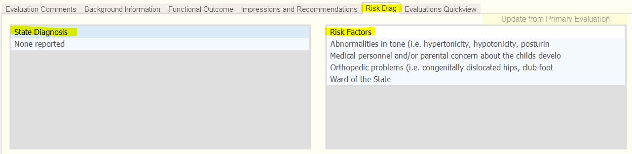 - Two tabs to the right is the “Risk Diag” tab with the State Diagnosis and Risk Factors. These can both be “none” but must be filled out (no assuming none if left blank).