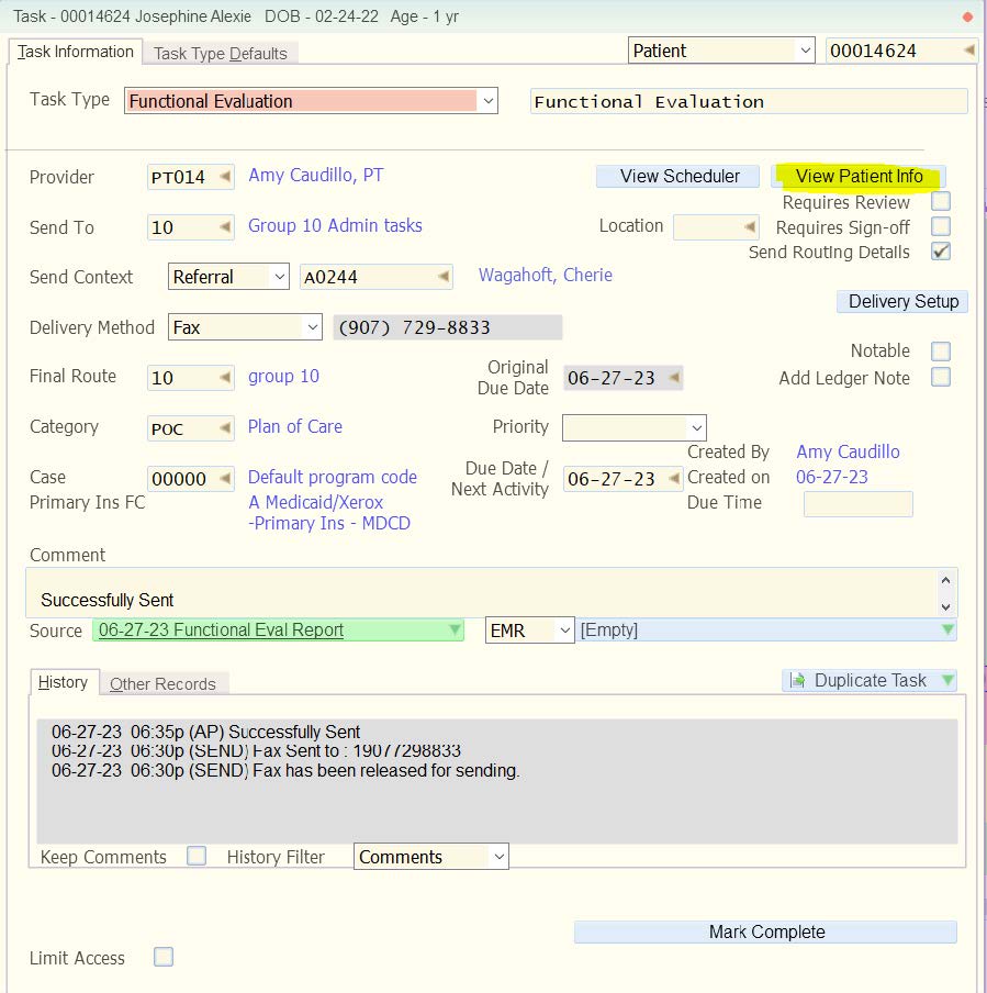 - The category for functional evals is “FUNEV” and you can sort group 10 tasks by type to get all the same task type together. The task will look like this and you can tell who the primary provider is (Amy Caudillo), where the eval was sent (the PCP per the consent to eval sig form, Cherie Wagahoft) and the child (Josephine Alexie). Click on View Patient Info or you can also type “C” when the task is highlighted to take you directly to the chart without looking at the task.