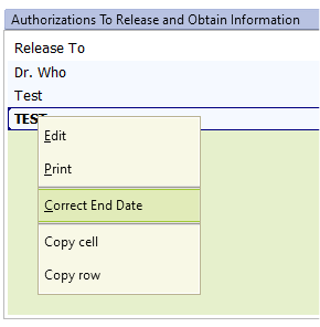 When a child is exited from PIC services, the end dates for the ROIs on file are automatically updated to be 90 days from the date of exit status. Admin can manually update these from either a) a change in placement from OCS updated ROI or b) family signed revocation (hard copy) by right clicking on the specific ROI in the Admin tab of the child’s chart and choosing “Correct End Date” (shown below)