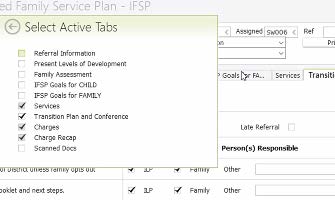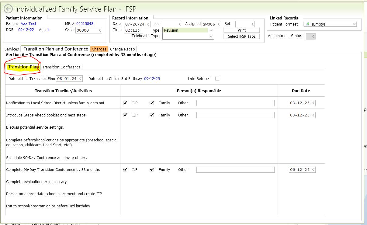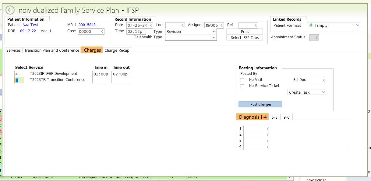 5. Charges tab: enter in the IFSP begin/Time in and end/Time out clock times for IFSP Development (if you also happened to complete the Transition Conference enter that time)