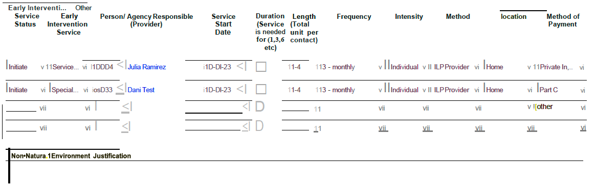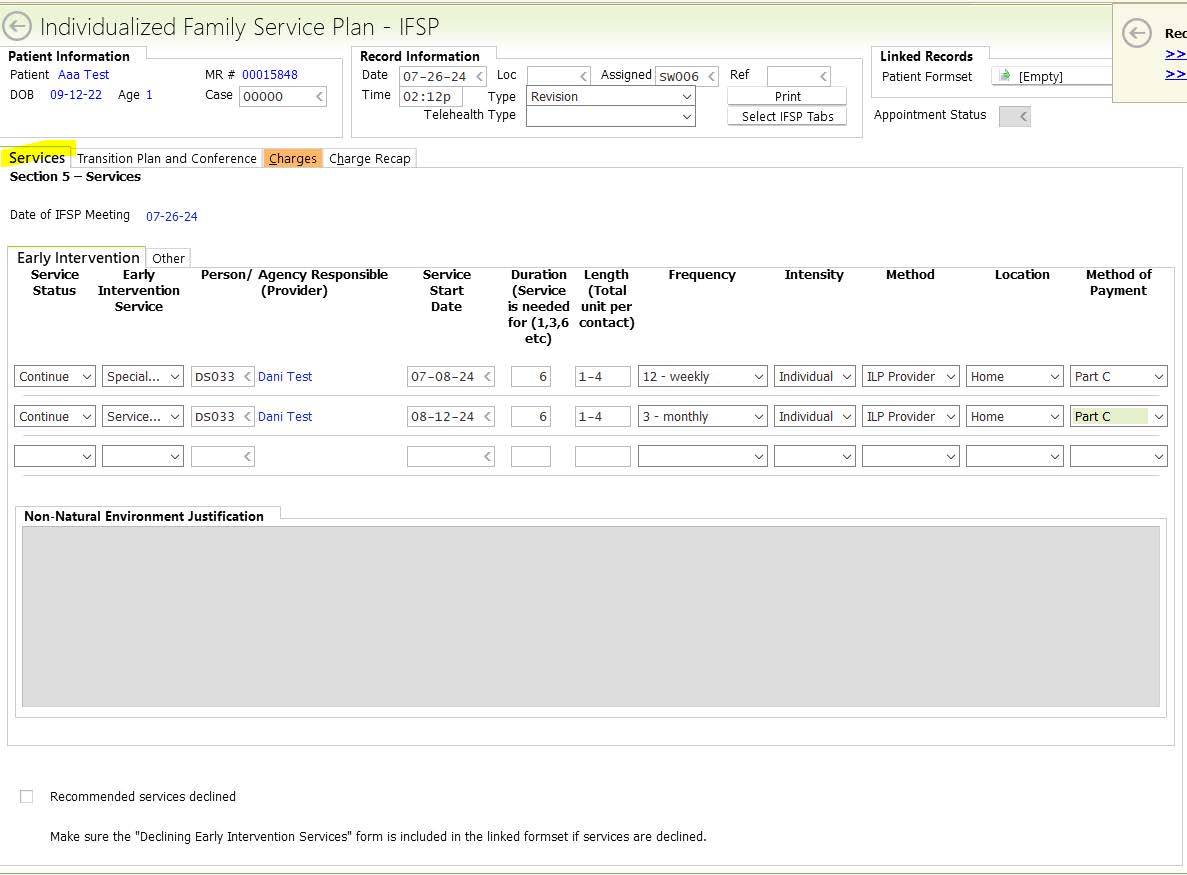 Note: Selecting a non-natural environment is rare, however, there’s a section in the IFSP that is required when ‘Other’ is selected as the Location for services. Non-Natural Environment Location Justification: Note why the child is receiving services in a non-natural environment.